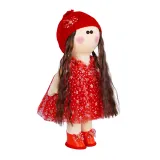 این عروسک با ظاهری فانتزی و دلنشین، دارای موهای بلند، لباس توری گلدار قرمز و کلاه بافتنی همرنگ است که ظاهری دخترانه و گرم به آن میبخشد. چهره ساده و لطیف عروسک حس بیگناهی و شیرینی خاصی را القا میکند و برای بسیاری از کودکان دلنشین خواهد بود.