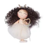 عروسک روسی فرشته مو مشکی قلب به دست 22 سانتی متری با موهای فر مشکی و چهرهای خندان و مهربان یکی از بهترین هدایا برای موفرفریها است. این عروسک یک دختر خانم شیک پوش و بهروز با یک دست لباس توری، چوبدستی و یک تاج مرواریدی در رنگ کرم طلایی است. عروسکی باکیفیت از جنس پارچه مخمل و نرم که قابلیت استفاده به عنوان یک دکوری لوکس و ارزشمند را هم دارد.